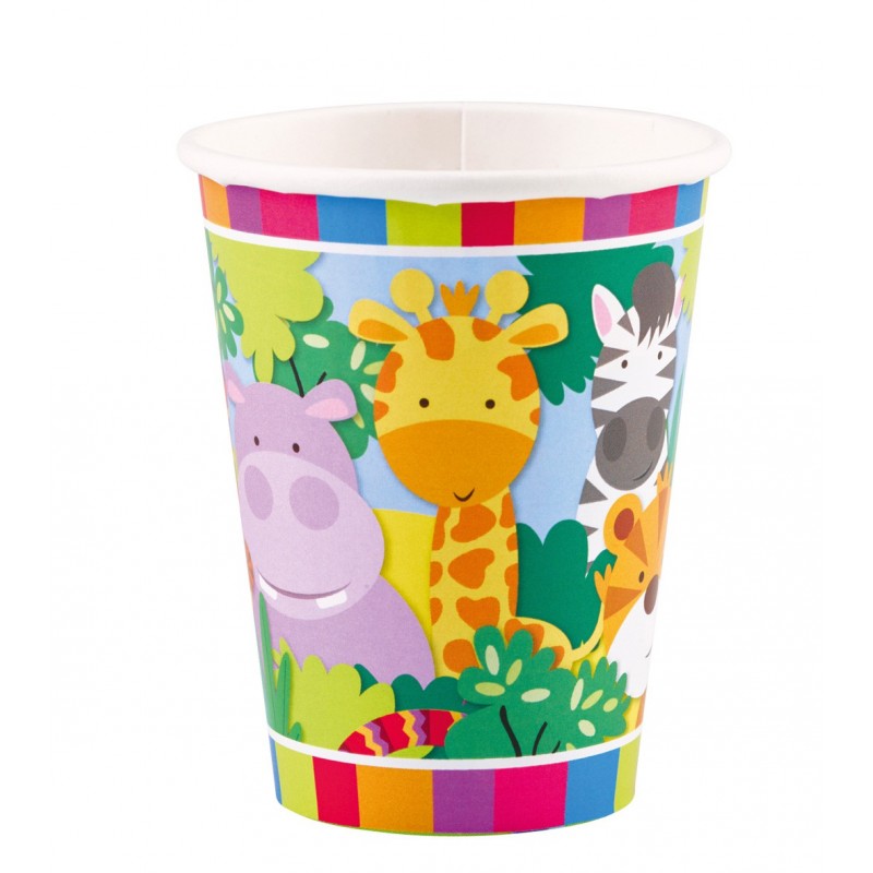 Bicchieri in carta del coordinato Amici della Giungla, decorati con simpaticissimi animali della giungla (giraffa, leone, zebra, tigre, ippopotamo, coccodrillo), super colorati e divertenti, ideali per festa compleanno dei bambini più piccolini! Abbina agli altri articoli del coordinato e accessori e decorazioni in tinta unita.