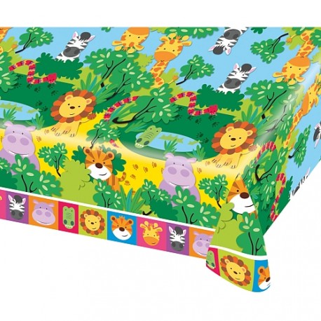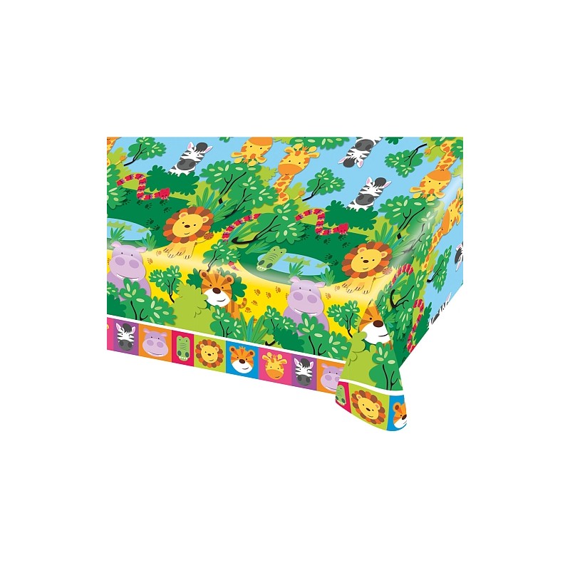 Tovaglia plastica del coordinato Amici della Giungla, decorati con simpaticissimi animali della giungla (giraffa, leone, zebra, tigre, ippopotamo, coccodrillo), super colorata e divertente, ideale per festa compleanno dei bambini più piccolini! Abbina agli altri articoli del coordinato e accessori e decorazioni in tinta unita.
