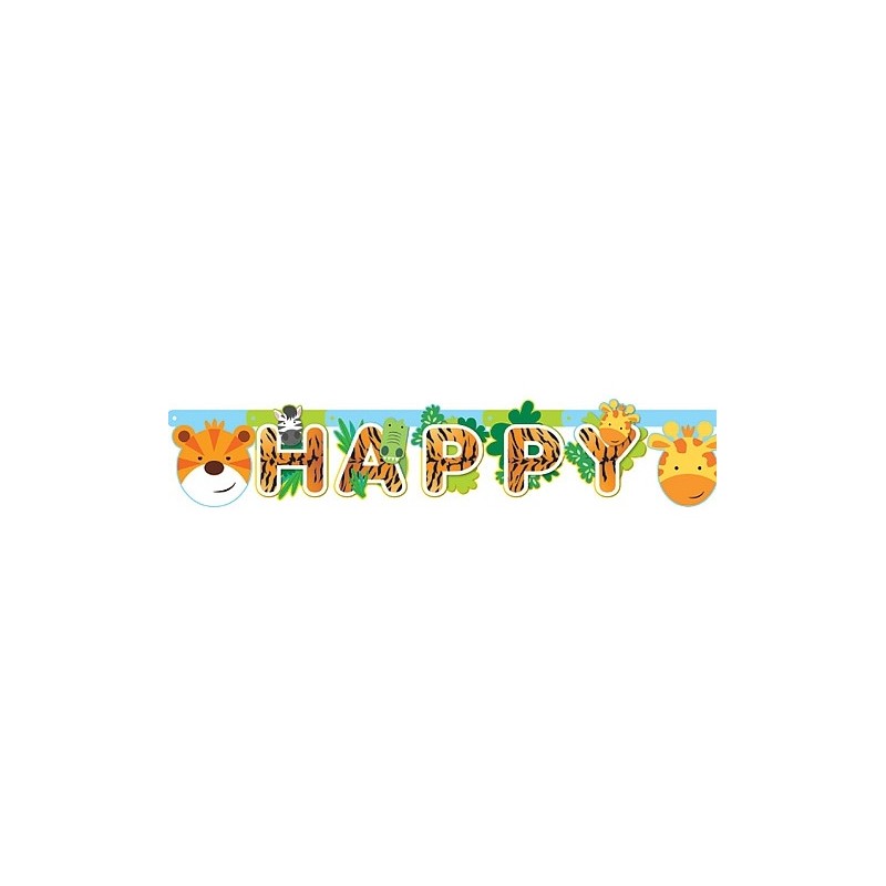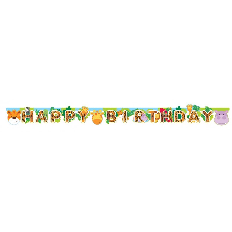 Festone compleanno snodabile in cartoncino, del coordinato Amici della Giungla, con il messaggio "Happy Birthday"e raffigurando simpatici animali della giungla, una bellissima decorazione per le festa compleanno, specialmente quelle a tema Giungla. Può esse riutilizzato varie volte.