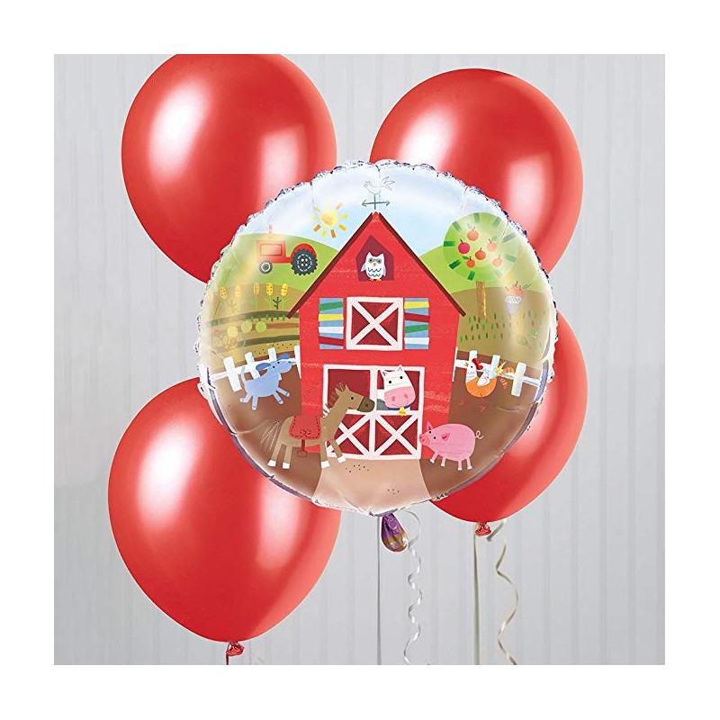 Palloncino foil decorato a tema Fattoria, con un fienile rosso e gli animali. Può essere gonfiato ad elio (per farlo fluttuare) o aria, utilizzando una pompetta o una semplice cannuccia. Puoi abbinarlo ad altri palloncini foil per creare un bouquet di palloncini, perfetto per decorare il tavolo della festa!