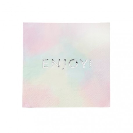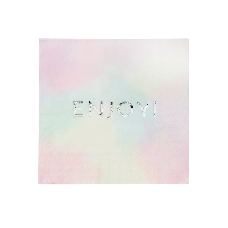 Con i suoi delicati colori pastello in effetto acquerello e la scritta "Enjoy!" in foil colore argento, questi tovaglioli super speciali daranno un tocco di originalità a feste di compleanno, baby shower, addio al nubilato e altre occasioni speciali.