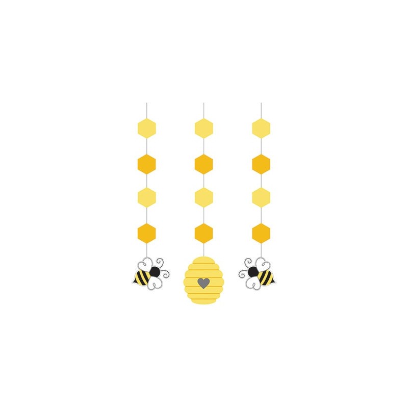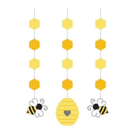 Set con 3 pendenti decorativi in cartoncino dell'adorabile coordinato Bumblebee Baby per festa compleanno bambina o baby shower a tema ape. Abbinalo agli altri articoli del coordinato e in tinta unita giallo per una decorazione dolcissima!