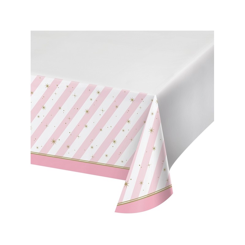 Tovaglia plastica a righe rosa e bianco, decorata con stelline colore oro, del coordinato Ballerina. Abbinali agli altri articoli del coordinato per una festa indimenticabile!