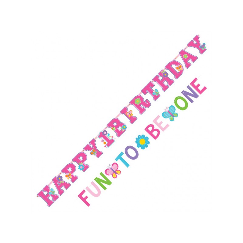 Set con 2 festoni primo compleanno bimba, in cartoncino e decorati con farfalle e fiorellini, sono la decorazione perfetta per un dolcissimo primo compleanno! Puoi appenderli insieme oppure separatamente. Abbinali agli altri articoli del coordinato per una decorazione completa!