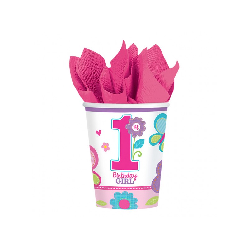 Bicchieri in carta a tema Farfalle per primo compleanno bambina. Abbinalo agli altri articoli del coordinato Farfalle o in tinta unita rosa e fucsia per creare un tavolo stupendo per la sua festa!