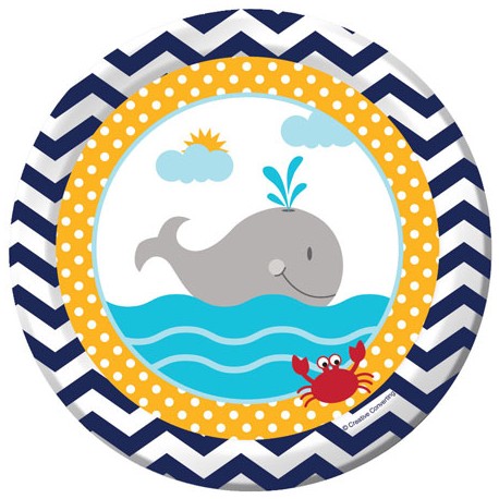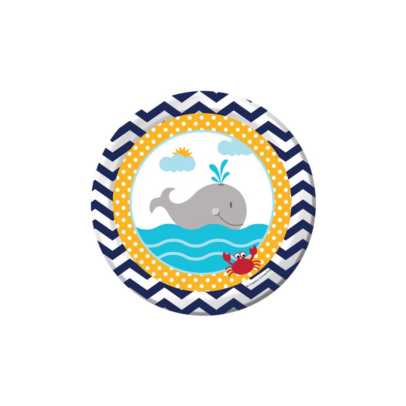 Tutti al mare! Una simpatica balena è la protagonista in questi piattini in carta del delizioso coordinato Marinaio. Perfetto per le feste di compleanno dei piccolini!