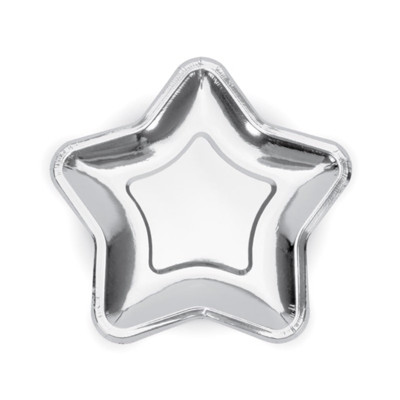 Piattini a forma di stella in carta con finitura metallizzata colore argento.
