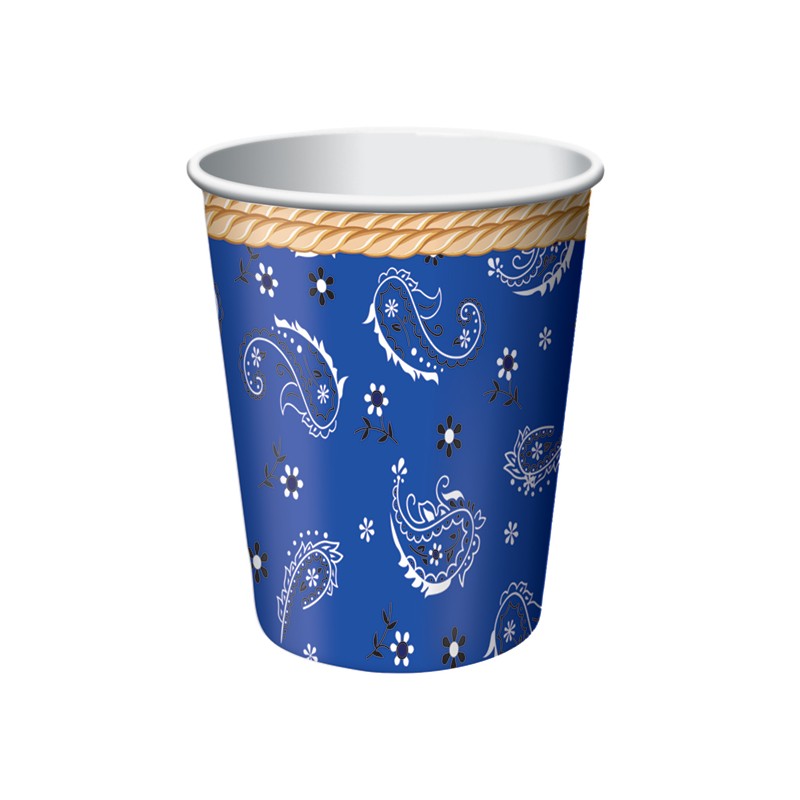 Bicchieri in carta del coordinato Blue Bandana per festa a tema Western. Abbina agli altri articoli del coordinato, accessori e decorazioni country.