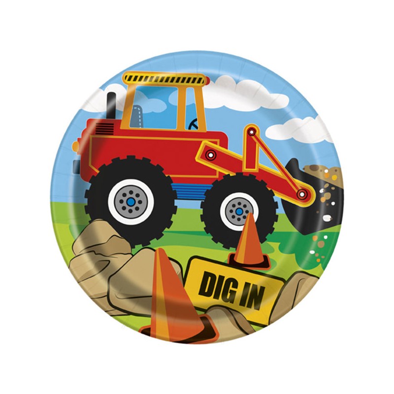 Piattini in carta decorati con una ruspa che lavora in un cantiere da costruzione. Per i bambini appassionati dai trattori, escavatori e tutti i veicoli da costruzione, questo è il coordinato per festa di compleanno perfetto! Abbinali agli altri articoli del coordinato, aggiungi anche i giocattoli del tuo bimbo per una decorazione stupenda della festa nel cantiere!