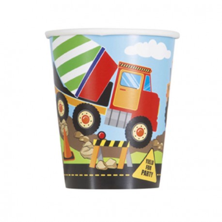 Bicchieri in carta decorati con una betoniera che lavora in un cantiere da costruzione. Per i bambini appassionati dai trattori, escavatori e tutti i veicoli da costruzione, questo è il coordinato per festa di compleanno perfetto! Abbinali agli altri articoli del coordinato, aggiungi i giocattoli del tuo bimbo per una decorazione stupenda della festa nel cantiere!
