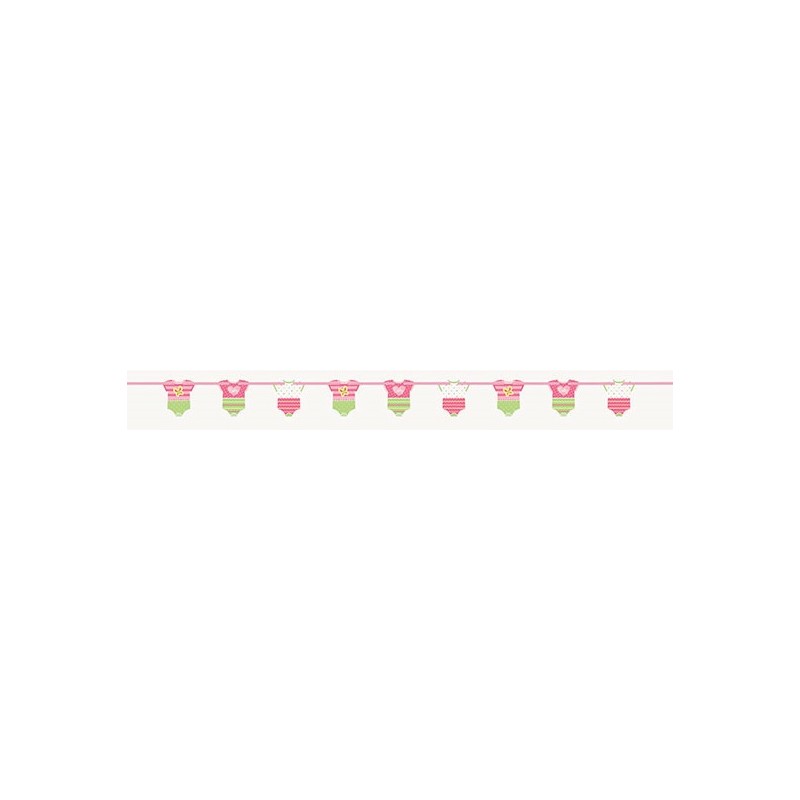 Ghirlanda di vestitini Pink Dots per decorare le feste baby shower bimba. La ghirlanda contiene 9 body in cartoncino in 3 diversi modelli, nei colori rosa e verde. I vestitini solo uniti da un nastro in tessuto rosa.