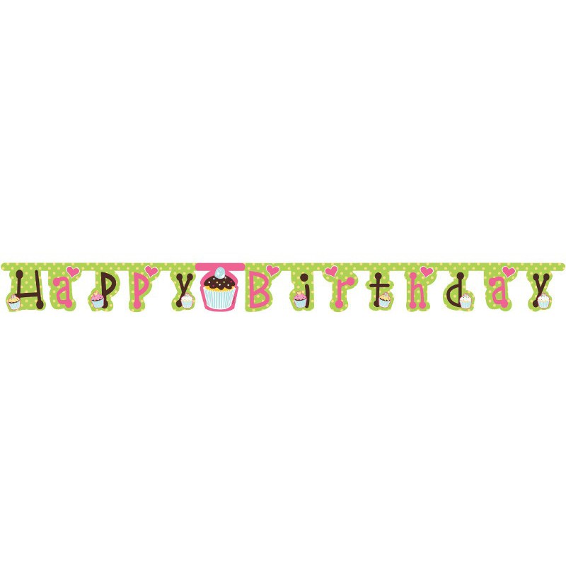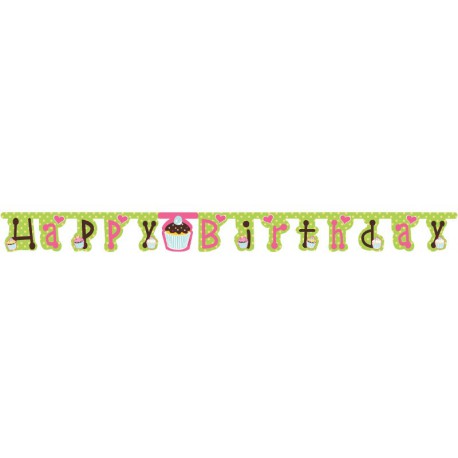 Questo bellissimo banner in cartoncino a pois verde e bianco, decorato a tema cupcake è perfetto per le feste compleanno delle bambine di ogni età!