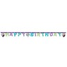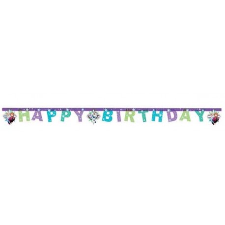Festone Happy Birthday in cartoncino del coordinato Frozen Snowflakes raffigurando Elsa, Anna e Olaf. Fantastico come decorazione e per augurare buon compleanno. Abbina agli altri articoli del coordinato per festa a tema Frozen!