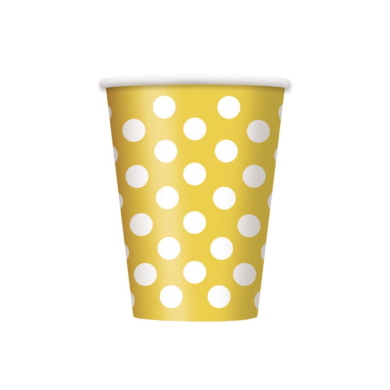 Questi bicchieri in carta alta qualità nel colore giallo a pois bianco sono più capienti, quindi ideali anche per gli adulti. Abbina agli altri articoli del coordinato in tinta unita giallo per una decorazione perfetta!