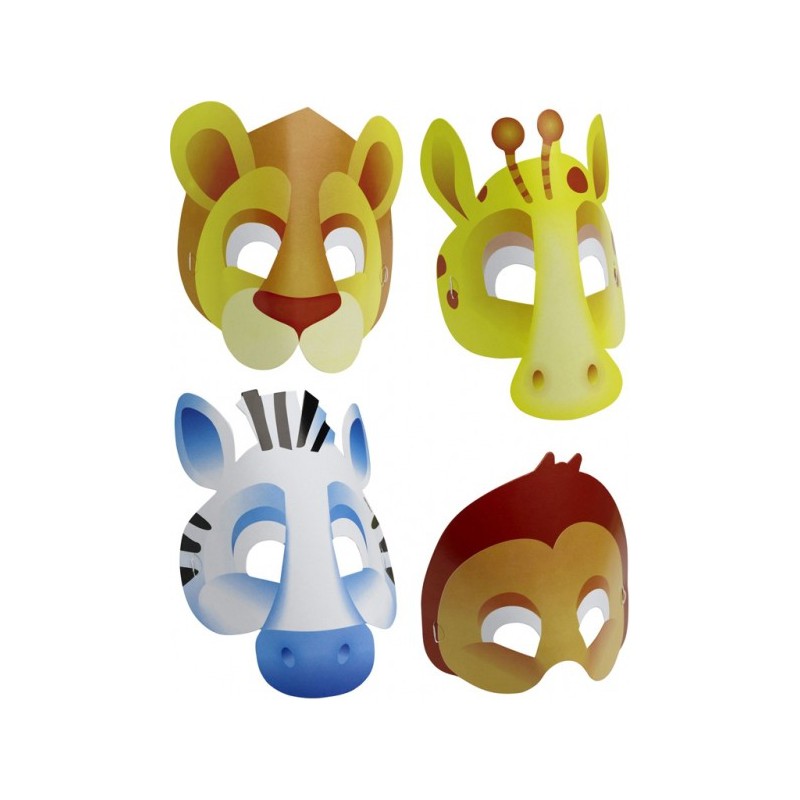 Questo set di 8 maschere assortite per bambini (leone, zebra, girafa e scimia) è un divertente gioco e ottimo come regalini per le feste di compleanno a tema Giungla! Le maschere sono realizzate in cartoncino e hanno un elastico per indossarle.