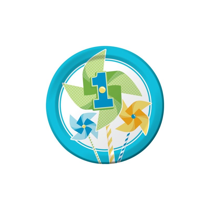 Tutto il fascino delle girandole al vento per una splendida festa di primo compleanno per i piccoli bimbi. Abbina questi piatti in carta agli altri articoli del coordinato e complementi in azzurro e verde per una decorazione stupenda.