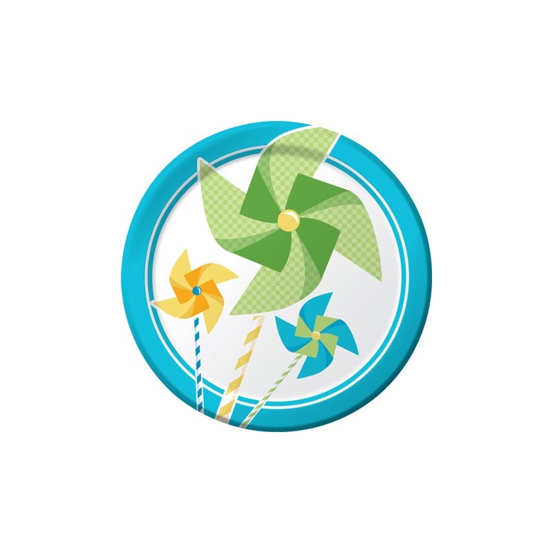 Tutto il fascino delle girandole al vento per una splendida festa di primo compleanno per i piccoli bimbi. Abbina questi piattini in carta agli altri articoli del coordinato e complementi in azzurro e verde per una decorazione stupenda.