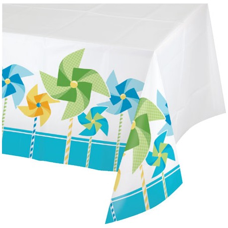 Tutto il fascino delle girandole al vento per una splendida festa di compleanno per i piccoli bimbi. Abbina questa tovaglia plastica agli altri articoli del coordinato e complementi in azzurro e verde per una decorazione stupenda.