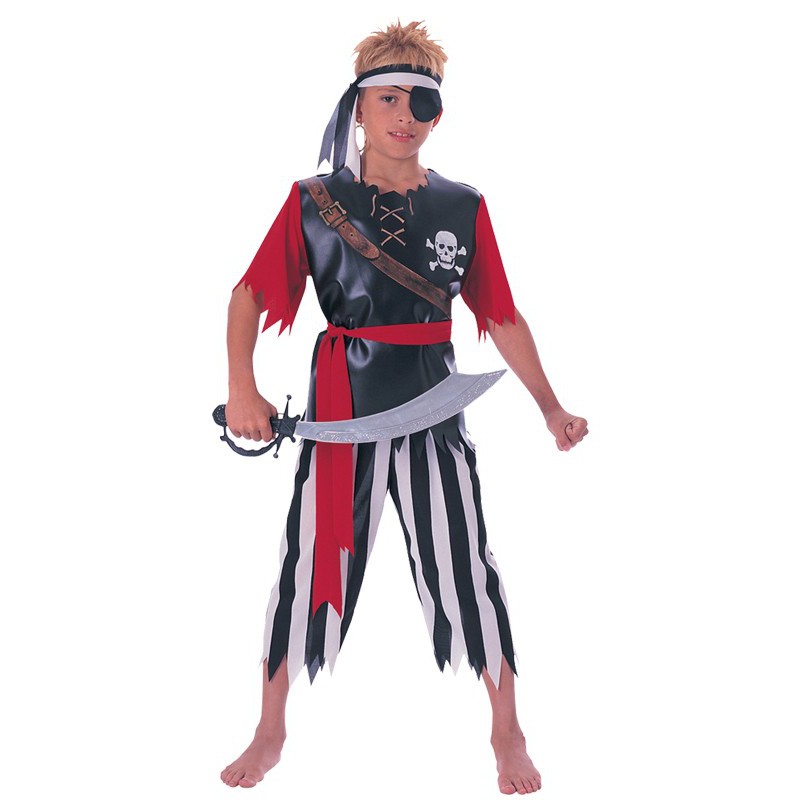 Costume Re dei Pirati per bambino. Per carnevale o festa a tema pirati. Con fascia, camicia stampata con frontale in vinile, pantaloni e fusciacca in vita. Spada e benda non incluse.