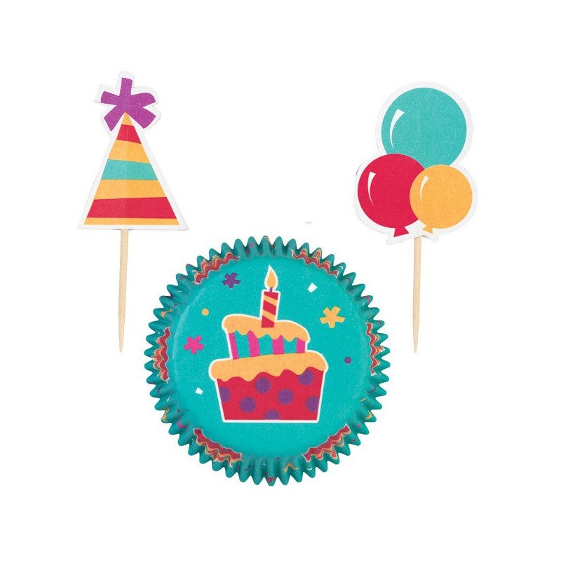 Divertente kit Wilton per decorazione di cupcakes con 24 pirottini in carta da forno e 24 stecchini decorati. Perfetto per le feste di compleanno!