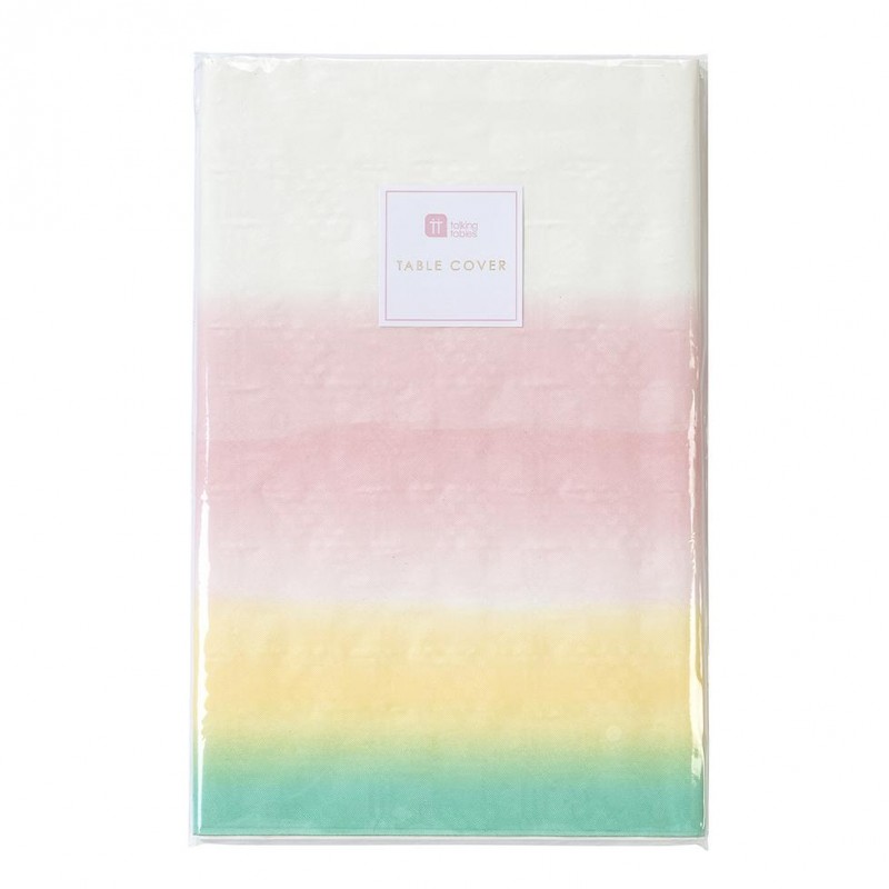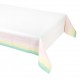 Tovaglia in carta decorata nei bordi in colori pastello verde, giallo e rosa.