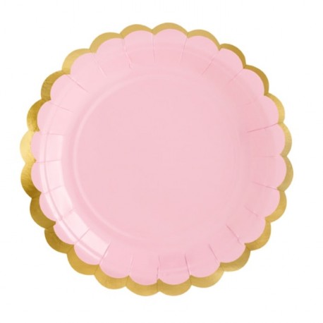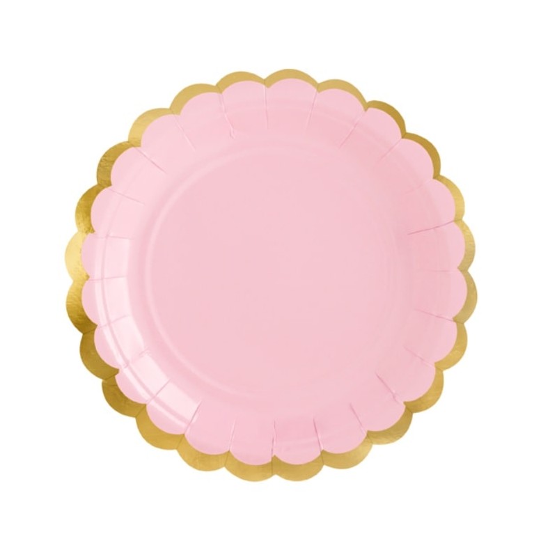Piattini sagomati in carta colore rosa pastello con i bordi decorati in oro foil