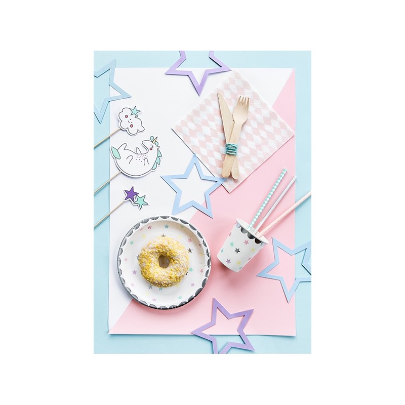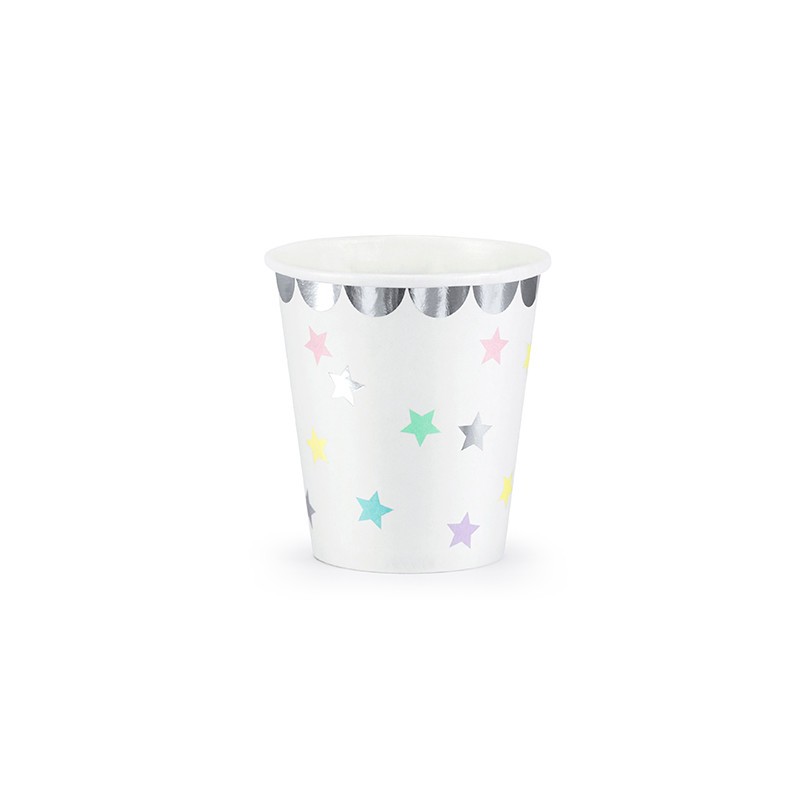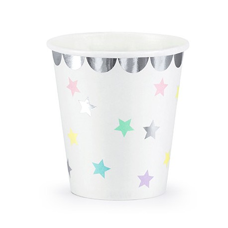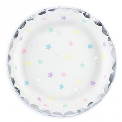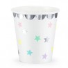 Questi bicchieri in carta bianca con stelline in colori pastello hanno il bordo decorato in foil argento. Sono adorabili per feste baby shower e compleanno bambina. Si abbinano perfettamente al coordinato "Make a Wish"! Abbinali agli altri articoli del coordinato o in tinta unita rosa, azzurro o lilla.