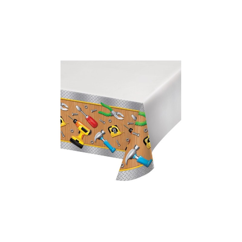 Tovaglia in plastica del coordinato Handyman, decorata con gli attrezzi che tanto affascinano i bambini. Abbinala agli altri articoli del coordinato, posate e palloncini in tinta unita nei tuoi colori preferiti per una decorazione perfetta!