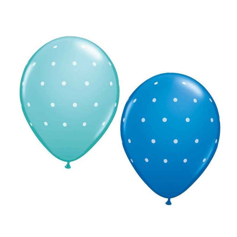 Palloncini assortiti in 2 colori (turchese e blu) a pois. Possono essere gonfiati sia ad aria che a elio.