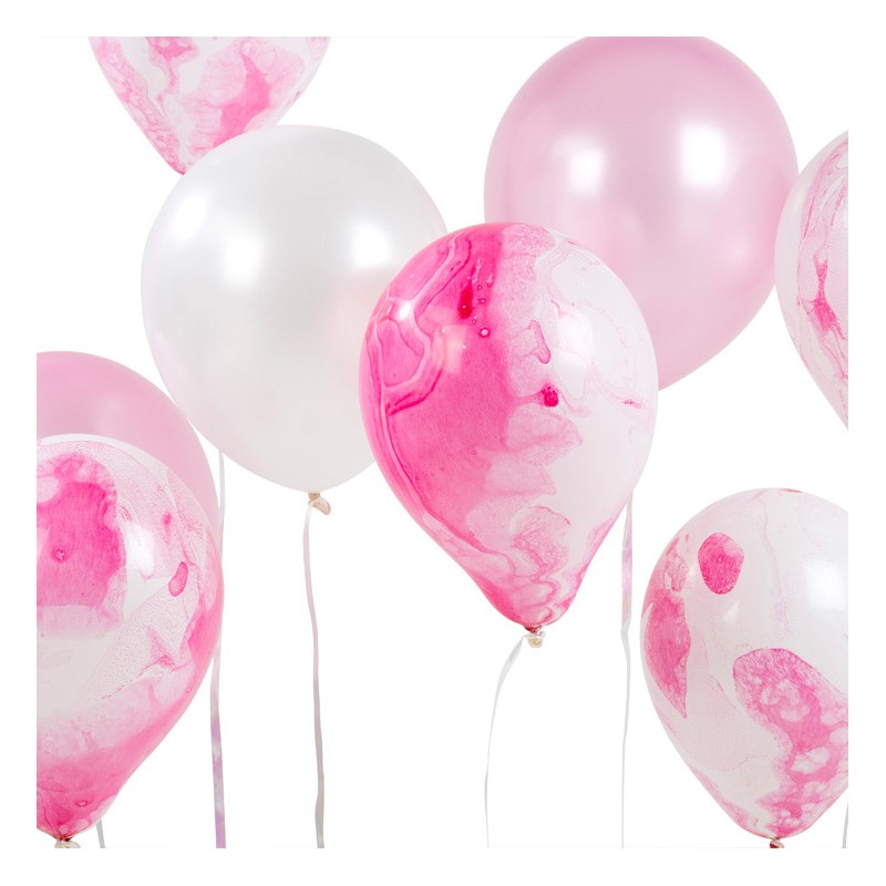 Crea una decorazione trendy e originale per la tua festa con palloncini ad effetto marmo! Questo set contiene 12 palloncini in 3 diversi design (marmo rosa, rosa e bianco perlati) ed è completo di 20m di nastro. Utilizza le nostre bombole elio per gonfiarli e farli volare separatamente o insieme in un stupendo bouquet!
