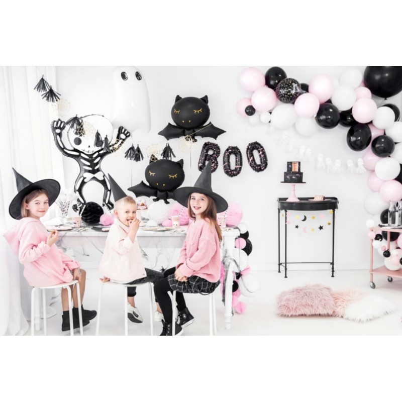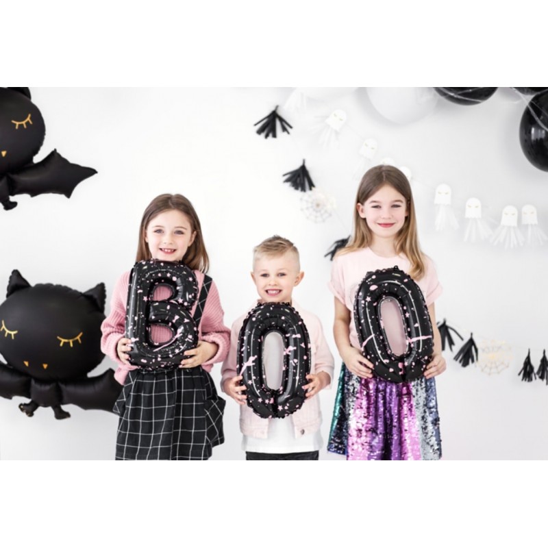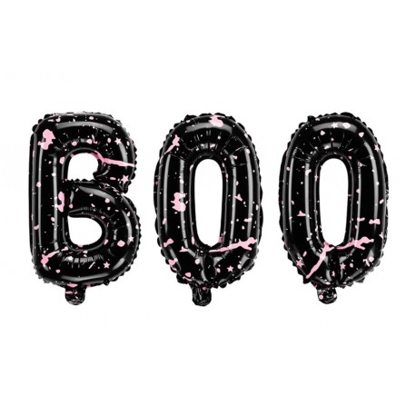 Set di tre palloncini foil neri con stampa rosa a forma di lettere formando la scritta "BOO", perfetto per le decorazione festa Halloween! Gonfiare utilizzando una pompetta per palloncini o una semplice cannuccia (Non è inviato gonfiato).