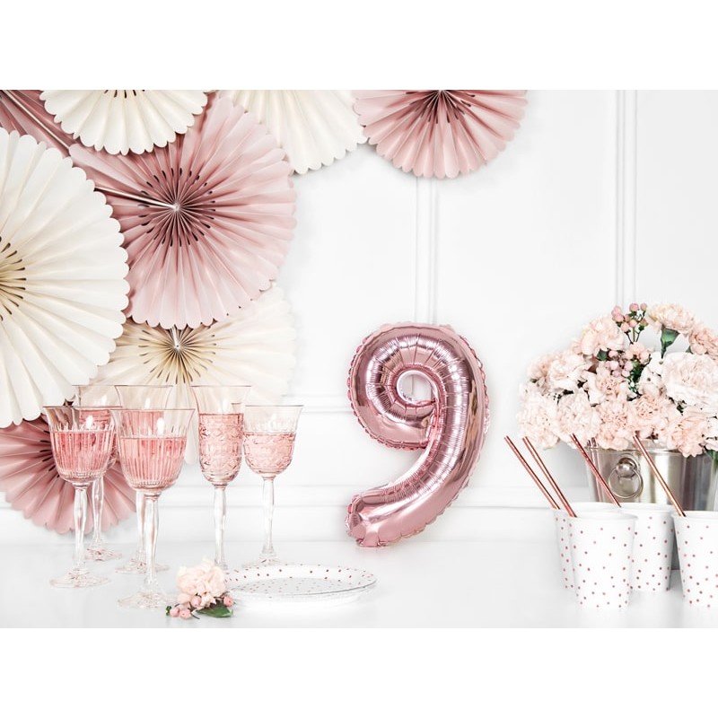 Palloncino foil numero 9 colore oro rosa. Gonfiare ad aria utilizzando una pompetta o una semplice cannuccia (non è inviato gonfiato).