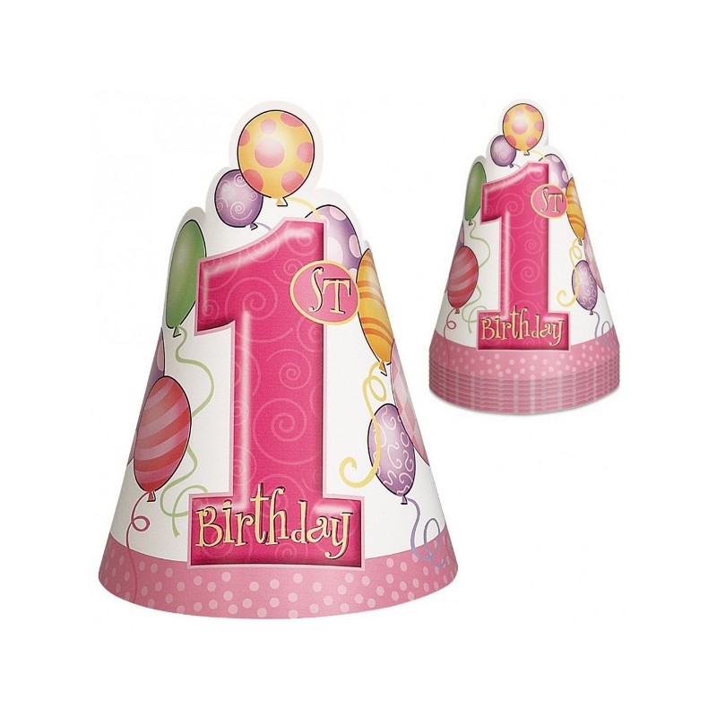 Questi bellissimi cappellini in carta del coordinato Palloncini Rosa sono stupendi per le feste di primo compleanno delle bambine. Hanno un formato più piccolo perfetto per i piccolini, non hanno la punta e si legano con un bellissimo nastrino rosa.