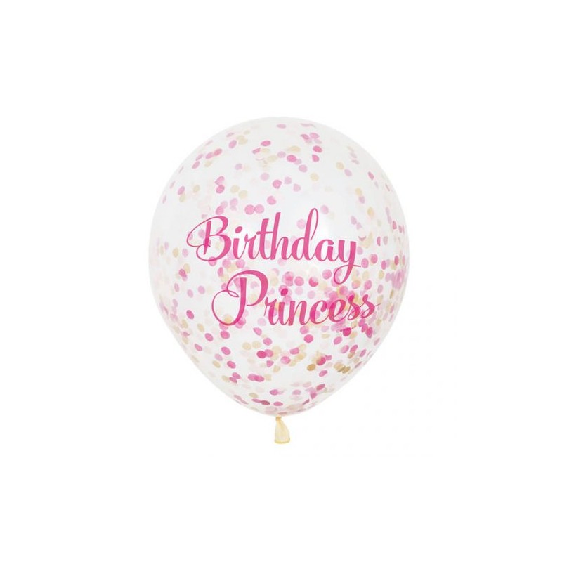 Set palloncini in lattice trasparente con la scritta Birthday Princess e coriandoli in diverse tonalità di rosa, stupendo per decorare feste compleanno delle piccole principesse! Prima di gonfiarli con aria e/o elio, inserisci i coriandoli in ogni palloncino (utilizzando il piccolo imbuto incluso).