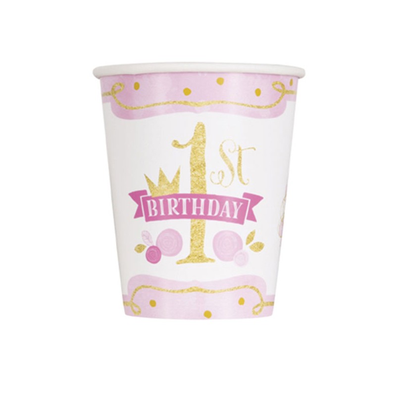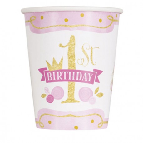 Bicchieri in carta del bellissimo coordinato Pink and Gold per festa 1 anno bimba nel colore rosa e oro, decorati con "1st Birthday" nel colore oro. Abbinali agli altri articoli del coordinato e complementi in rosa e oro per una decorazione stupenda per la festa di primo compleanno della tua bimba.