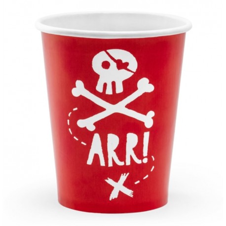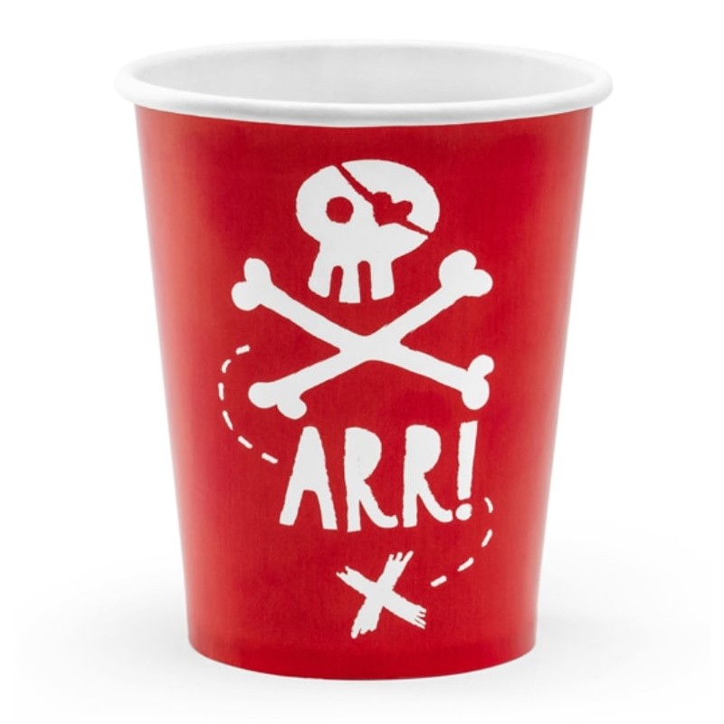 Bicchieri in carta rossi decorati con un teschio e il messaggio "Arr!", perfetti per le feste a tema Pirati! Abbinali agli altri articoli del coordinato Pirates Party per una decorazione completa!