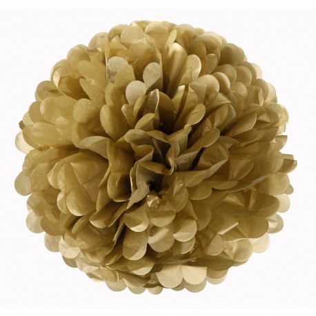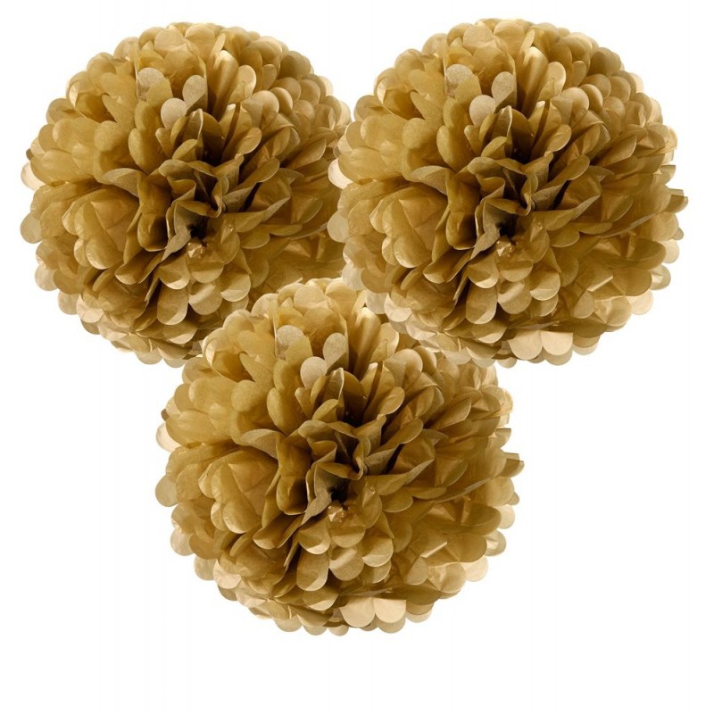 Pon pon in carta velina colore oro, per dare un tocco speciale alla decorazione della festa. Possono essere appesi al soffitto oppure collocati sul tavolo, meglio se in un set di diversi pon pon di dimensioni diverse.