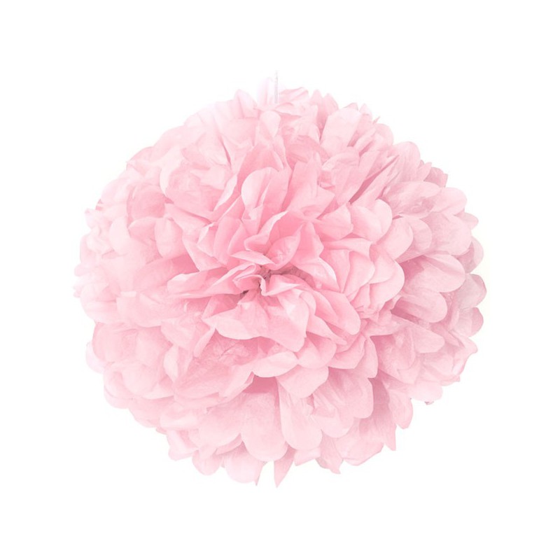 Pon pon in carta velina colore rosa pastello, per dare un tocco speciale alla decorazione della festa. Possono essere appesi al soffitto oppure collocati sul tavolo. Il pon pon è inviato piatto ed è facile da assemblare, basta aprire la sfera e separare gli strati di carta.