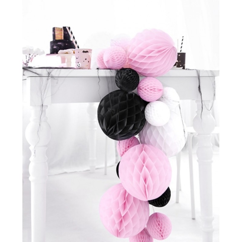 Sfera decorativa di carta a nido d'ape colore nero. Utilizzala insieme ad palloncini, ponpon e altre sfere per creare una decorazione davvero speciale! Può essere appesa oppure collocata sul tavolo.