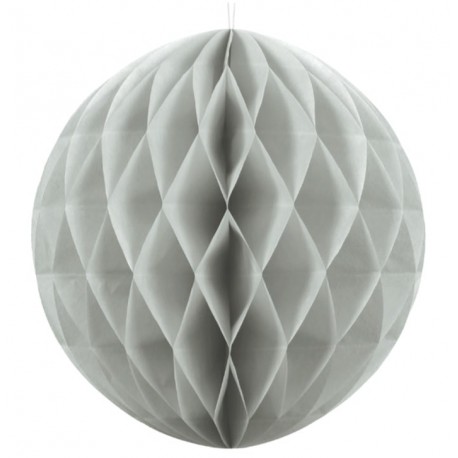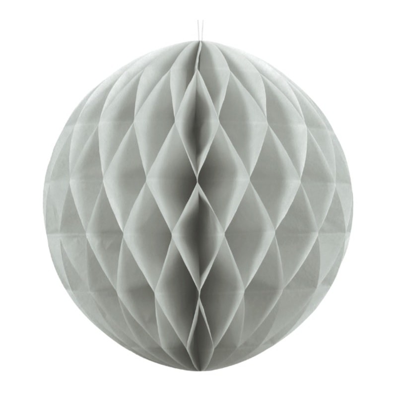 Sfera decorativa di carta a nido d'ape colore grigio pastello. Utilizzala insieme ad palloncini, ponpon e altre sfere per creare una decorazione davvero speciale! Può essere appesa oppure collocata sul tavolo. Scegli la dimensione.