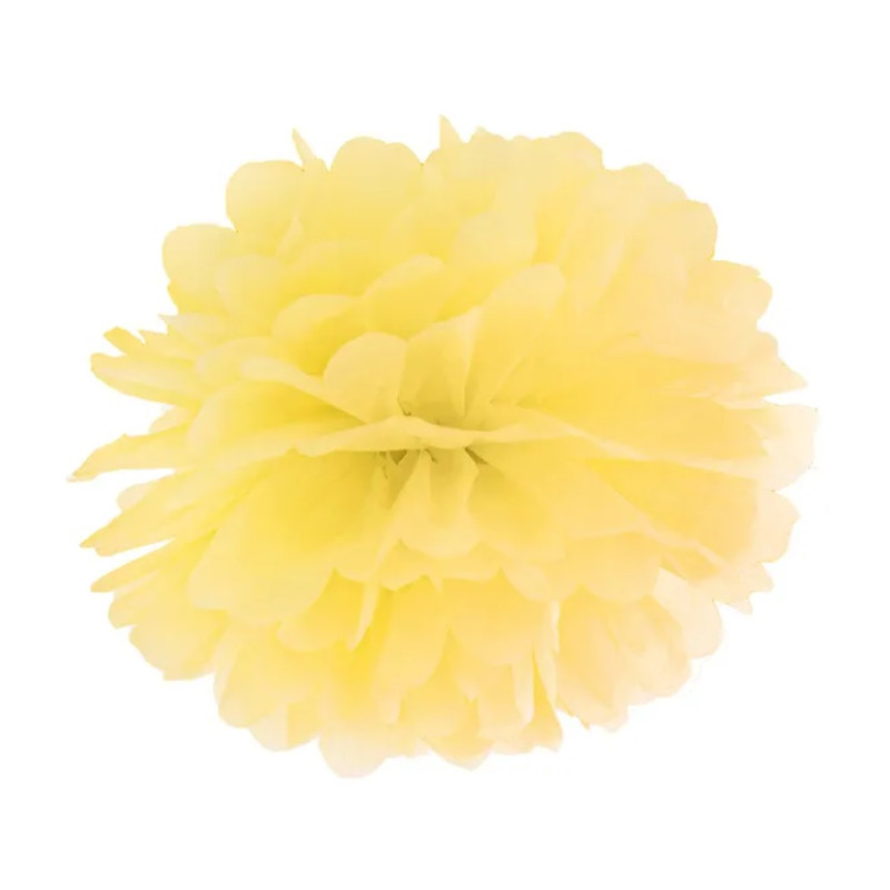 Pon pon in carta velina colore giallo pastello, per dare un tocco speciale alla decorazione della festa. Possono essere appesi al soffitto oppure collocati sul tavolo. Il pon pon è inviato piatto ed è facile da assemblare, basta aprire la sfera e separare gli strati di carta.