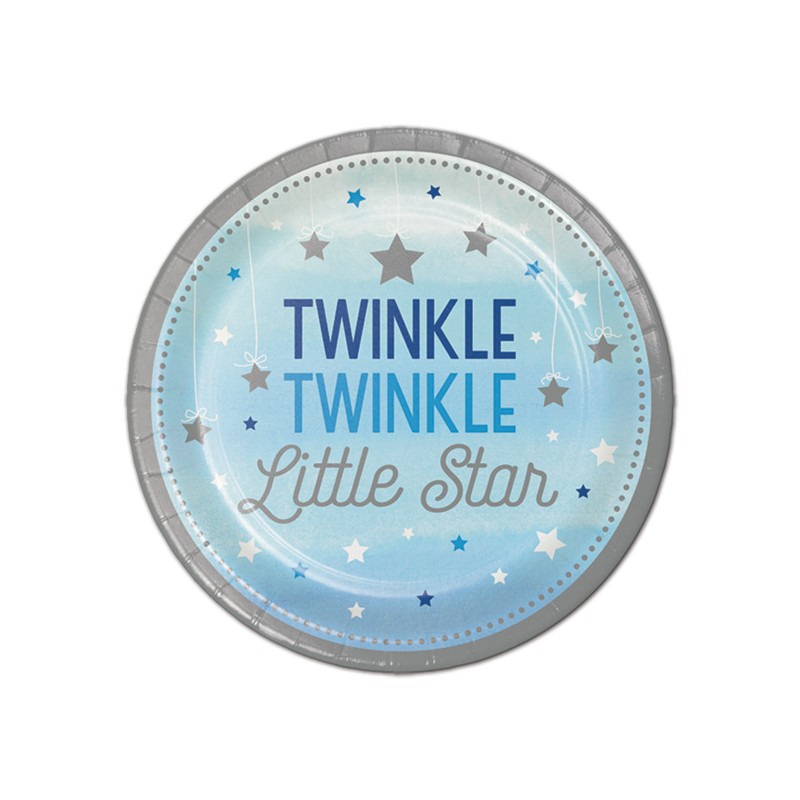 Piattini in carta azzurri, decorati con la frase "Twinkle Twinkle Little Star" e stelline nei colori blu, argento e bianco. Perfetto per servire la torta nella festa di compleanno della tua stellina! Abbinalo a altri articoli del coordinato e accessori in azzurro e oro.