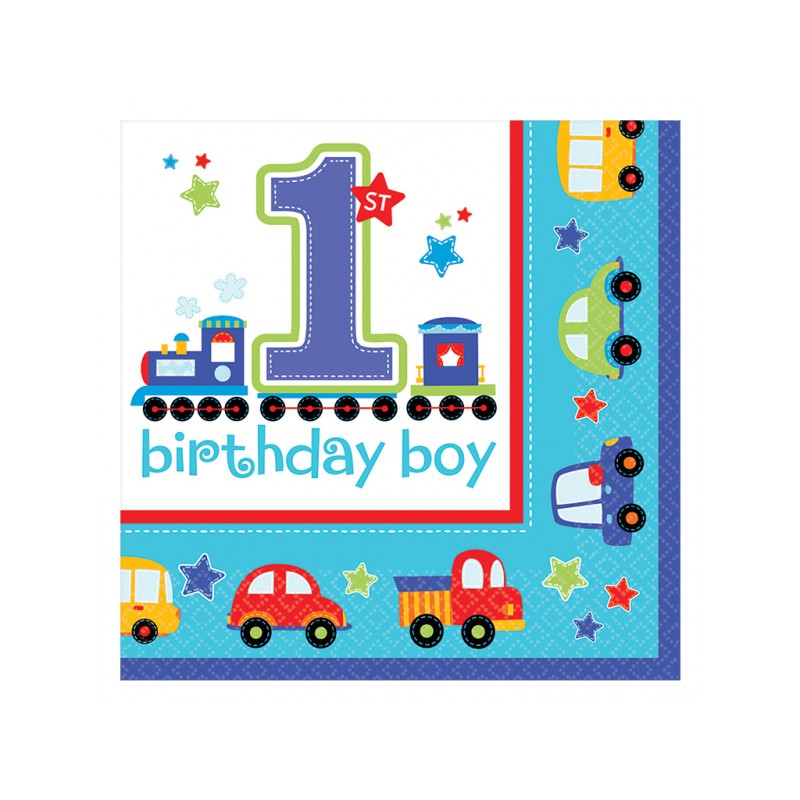 Tovaglioli in carta decorato con aerei, treni, macchine... Abbinalo agli altri articoli del coordinato Tutti a Bordo o in tinta unita blu, rosso e giallo per creare un tavolo stupendo per il suo primo compleanno!