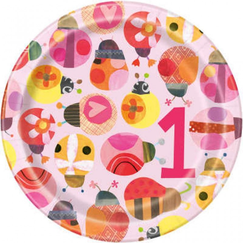 Piattini in carta del coordinato Coccinelle per primo compleanno bimba. Abbinali agli altri articoli del coordinato e accessori in tinta unita rosa, giallo, rosso e arancione.