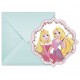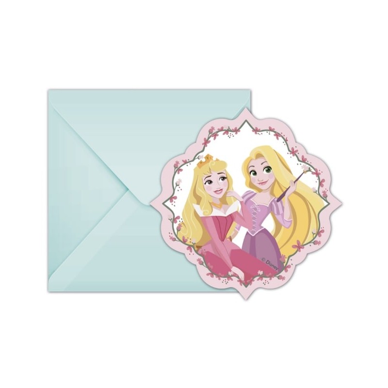 Per invitare gli amici alla festa a tema Principesse Disney niente di meglio di questi stupendi biglietti inviti in tema! Decorati in delicati colori pastello e le principesse Rapunzel e Aurora, sono completi anche delle bustine! Abbinali agli altri articoli del coordinato per una decorazione stupenda.
