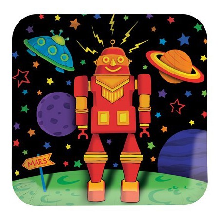 Piattino quadrato in carta del Coordinato Robot. Se guardati con la maschera dei Robot, hanno un incredibile effetto 3D! Abbina agli altri articoli dei Robot, posate e palloncini nei colori rosso, verde, arancione per una decorazione perfetta!