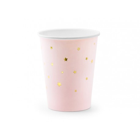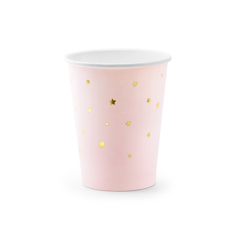 Bicchieri in carta rosa pastello a stelline oro. Abbinali ad altri articoli per la tavola e decorazioni nei colori oro e rosa pastello per creare la decorazione per la tua festa.