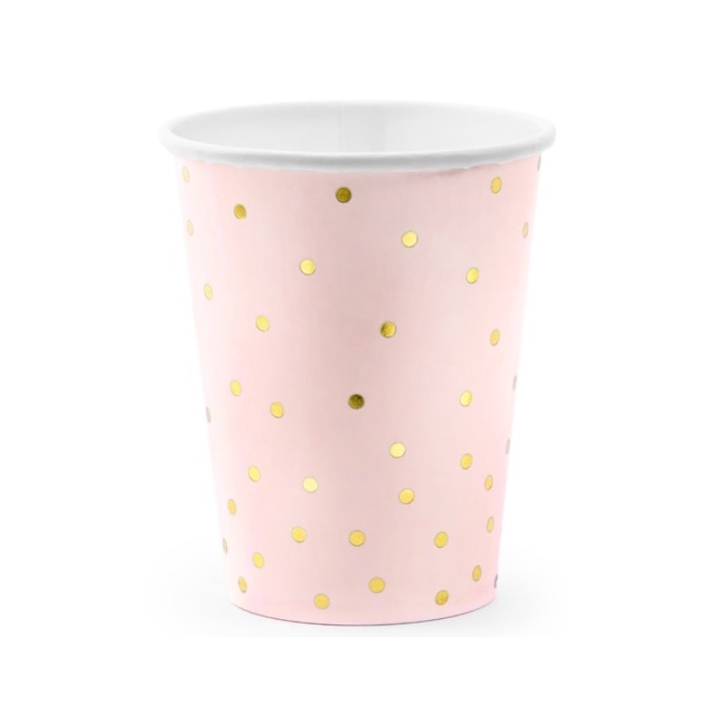 Bicchieri in carta rosa pastello a pois oro. Abbinali ad altri articoli per la tavola e decorazioni nei colori oro e rosa pastello per creare la decorazione per la tua festa.