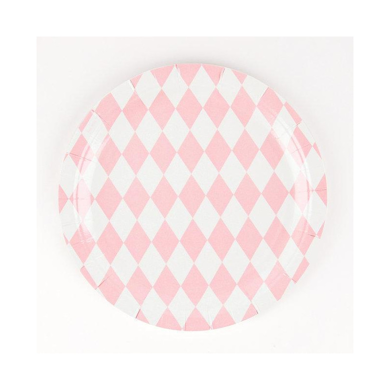 Piatti in carta decorati a rombi rosa. Abbinali agli altri articoli in tinta unita rosa.