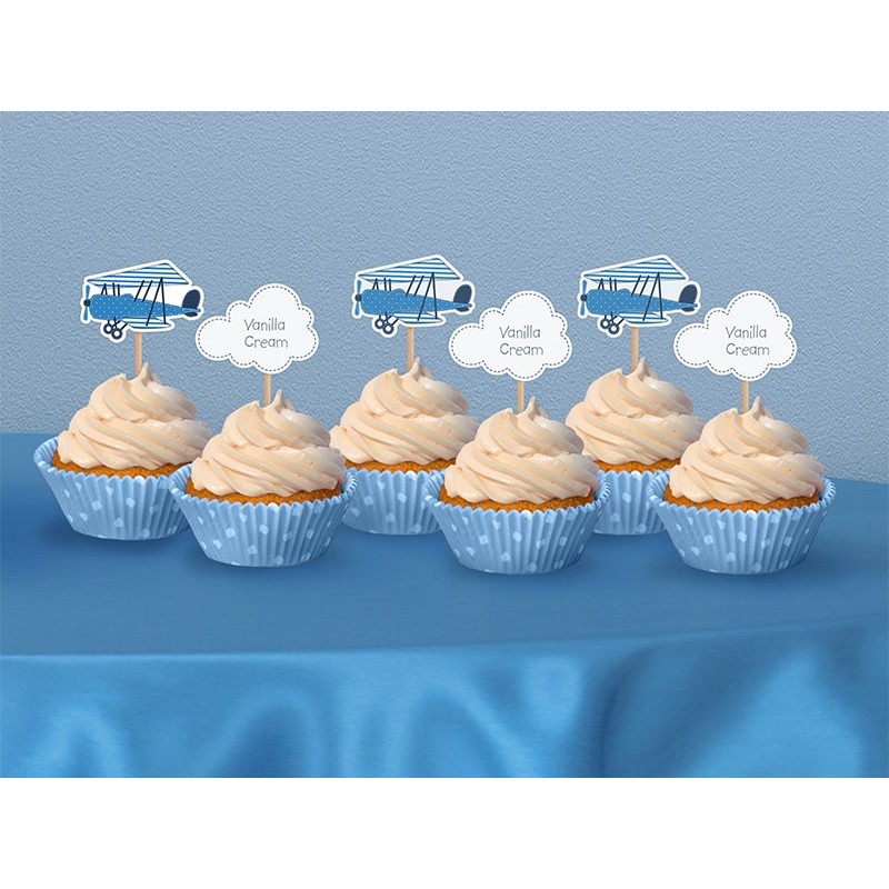 Stecchini decorati in 2 diversi modelli: aeroplano e nuvolette. Adorabili per decorare la torta, cupcake, panini e tutto il buffet della festa. Abbinamento perfetto agli altri articoli del coordinato Aeroplano.